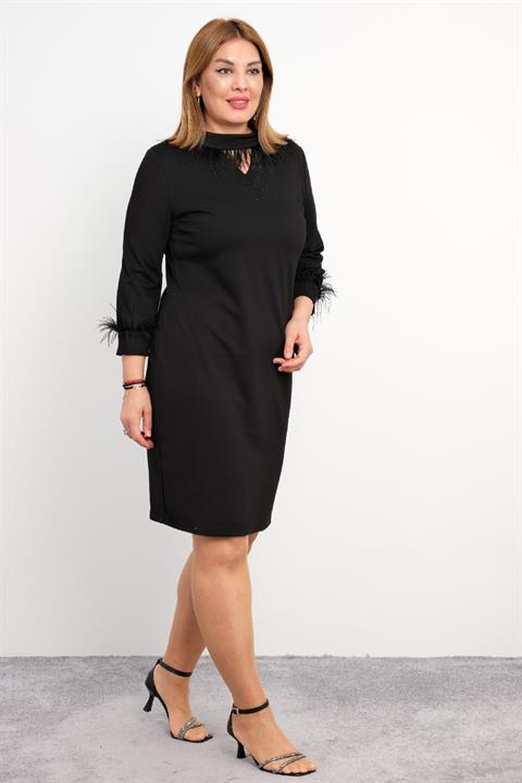 Bu elbise büyük beden kadınlar için özel olarak tasarlanmış bir gece elbisesidir. Siyah renkte olan bu elbise, şıklığı ve zarafetiyle dikkat çekmektedir. Kolsuz tasarımına rağmen, kolları tüy detaylarıyla süslenmiş ve dikkate değer bir görünüm kazandırılmıştır. Düz kesim ve diz hizasında biten boyu ile rahat bir tasarıma sahiptir. Gövde kısmında sade bir görünüme sahip olan elbise, ense kısmında küçük bir dekolteye sahiptir.